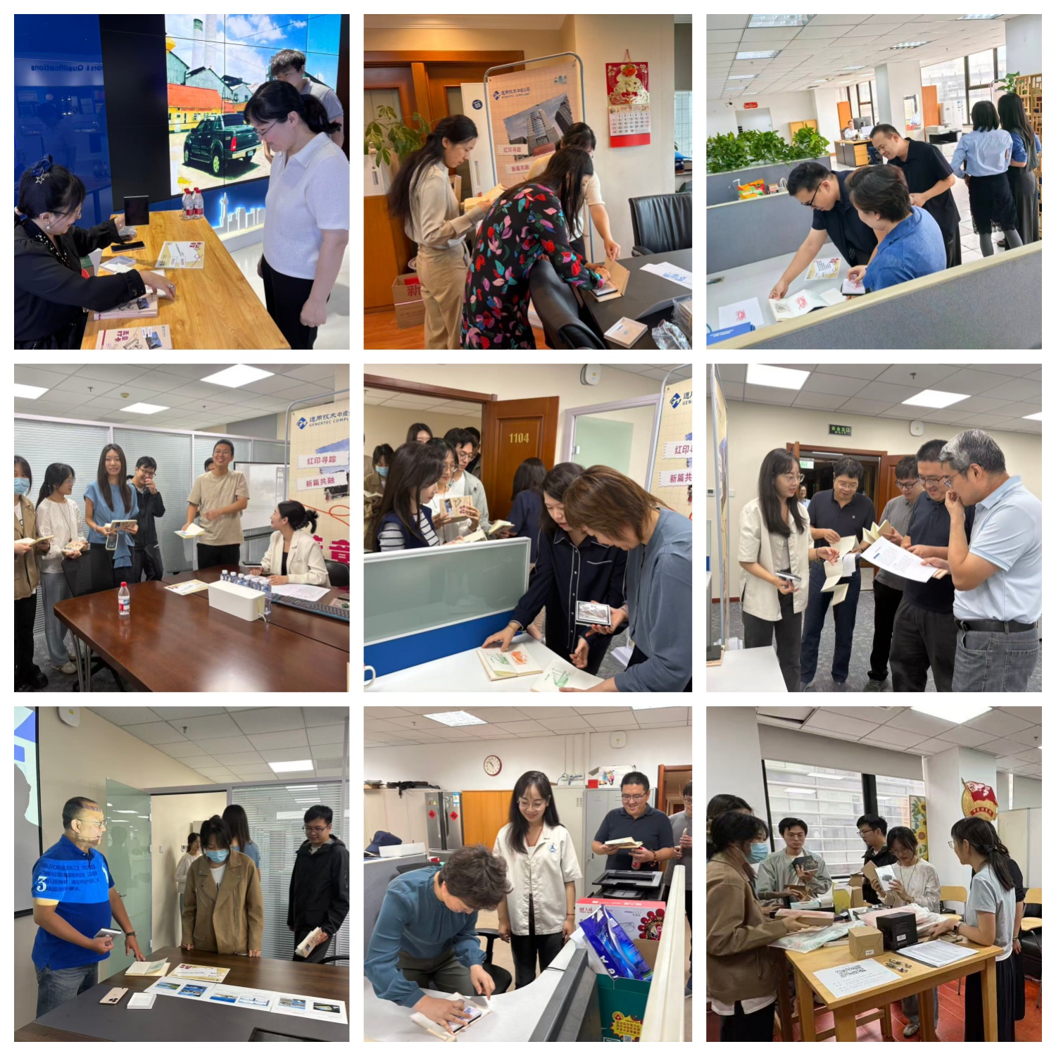 9月17日至19日,8個打卡點同步開放,在公司展廳、部分職能部門和業務部門分設“歷史紅印”和“業務新印”兩個維度打卡點,并配備歷史照片、文字材料,或由“打卡講解員”現場介紹業務亮點。員工在打卡點有序排隊,或認真聆聽講解,或熱烈討論問題,互相展示收集的印章,分享發現的公司發展小故事,在趣味問答和互動探索過程中,既集齊了專屬定制印章,又系統了解了公司發展脈絡與核心業務知識,更感受到了團隊的活力與公司的文化底蘊。